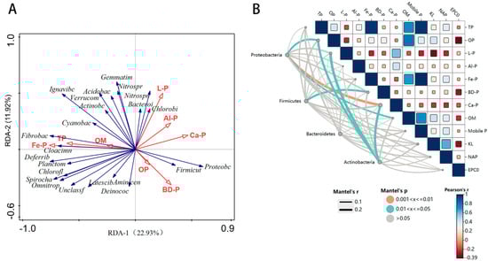 Figure 6A shows the RDA results for samples selected from different sediment layers at the six sampling locations, with 11.92% and 22.93% interpretations for the two RDA axes, respectively. The majority of surface sediment samples were concentrated in the first and second quadrants, where the influence of microbial communities and phosphorus patterns was particularly evident. As can be seen from Figure 6A, a positive correlation with TP is observed for Actinobacteria, Acidobacteria, and Chloroflexi. Bacteroidetes, Nitrospirae, Proteobacteria, and Firmicutes, on the other hand, are positively correlated with L-P, Ca-P, and Al-P. Previous studies have shown that phosphate-solubilizing bacteria promote the solubilization of phosphorus in the calcium-bound state [51]. Notably, Fe-P and OM, on the other hand, were negatively correlated with these microorganisms. It has been previously shown that Firmicutes will participate in the reduction of Fe (III) [52]. It can promote the dissolution of phosphorus in the iron-bound state. Proteobacteria, which were most abundant in the sediment, showed a significant positive correlation with OP concentrations, which would likely accelerate the conversion of OP to soluble IP, which would then be released from the sediment into the overlying water [24]. Proteobacteria and Firmicutes were positively correlated. A significant negative correlation was observed between Proteobacteria and the Actinobacteria and Acidobacteria groups.
