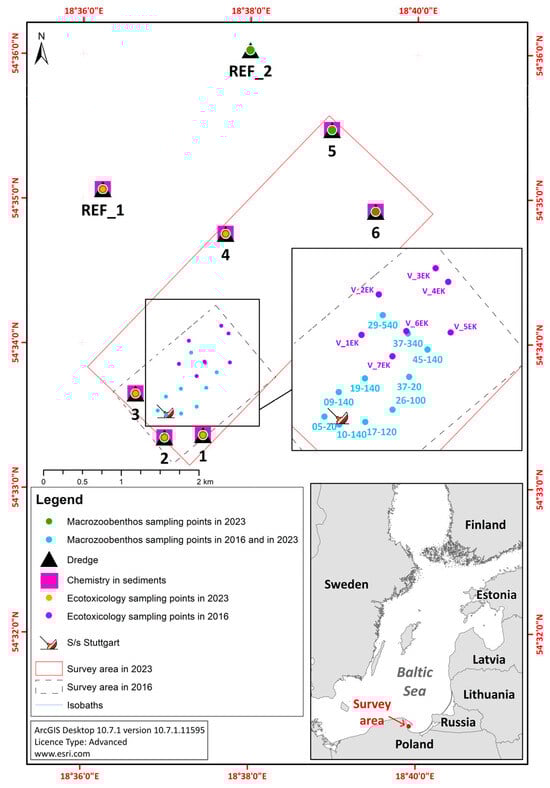 The shipwreck of S/s Stuttgart is located in the eastern part of the Gulf of Gdańsk, approximately 4 km from the shore (Figure 1). The wreck lies on the eastern slope of a sandy ridge extending in the SSW-NNE direction at a depth of approximately 21–22 m. The surrounding seabed has an uneven topography, with height differences of 1–3 m. The area consists mainly of fine- to medium-grained sands, with patches of silty sands and silts. Depressions in the seabed contain thicker layers of silty and clayey sediments, reaching up to 4 m in the central basin. These deposits rest on a substrate consisting of sands, gravels, and, in some places, glacial tills (Table S1). Chemical analyses were carried out at seven stations. Stations 1, 2, and 3 were selected to allow direct comparison with data from the 2016 survey, particularly for evaluating contaminant levels in mussel tissues. Additional stations were distributed to capture the potential spread of contaminants from the wreck site. A designated reference stations (REF_1, REF_2) was sampled to represent background conditions outside the assumed pollution plume. The number of chemical sampling points was optimized based on scientific priorities and limited by available financial resources.