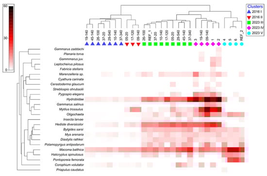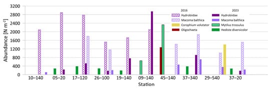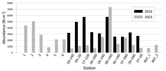 Macrozoobenthos abundance at individual stations in 2016 and 2023.