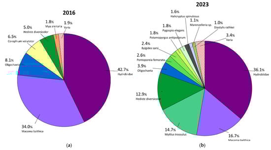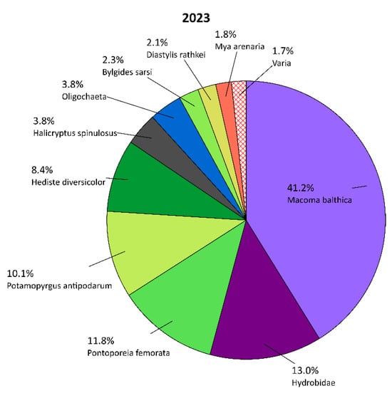 The composition of the macrozoobenthos is presented in pie charts below (Figure 3). In both 2016 and 2023, the community was dominated by Hydrobiidae snails and bivalves, including M. balthica, a species tolerant of polluted waters [23], and M. trossulus, which typically forms aggregations attached to the substrate. In 2023, the polychaete Hediste diversicolor also had a significant share in the community structure. Taxa with an abundance below 1% were classified as “varia”, and they accounted for 1.9% (5 taxa) in 2016 and 3.4% (13 taxa) in 2023.