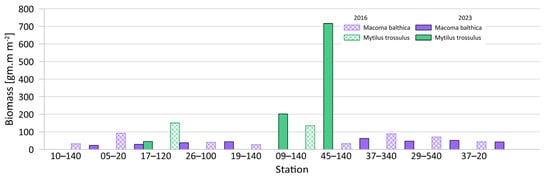 The biomass dominance structure of macrozoobenthos at 10 common stations surveyed in 2016 and 2023 is presented in Figure 8. Across these stations, macrozoobenthos biomass ranged from 34.640 g WW m−2 (19-140) to 282.610 g WW m−2 (17-120) in 2016 and from 42.048 g WW m−2 (10-140) to 808.151 g WW m−2 (09-140) in 2023. In 2016, bivalves, primarily M. balthica, dominated most stations, with biomass values ranging from 27.280 to 92.310 g WW m−2. M. trossulus was the dominant species at two stations: 17-120 (150.280 g WW m−2) and 09-140 (134.796 g WW m−2). In 2023, M. balthica continued to be the dominant species at most stations, with a biomass ranging from 23.125 to 62.330 g WW m−2. However, Mytilus trossulus exhibited significantly a higher biomass at two stations: 09-140 (716.393 g WW m−2) and 19-140 (201.478 g WW m−2) (Figure 8).