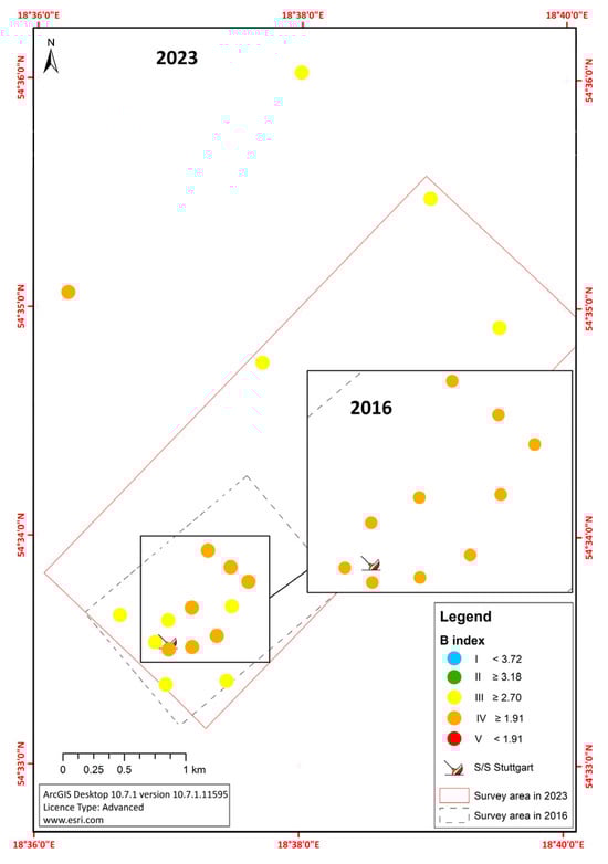 Distribution of the B index at given stations in the area of the S/s Stuttgart wreck in 2016 and 2023.