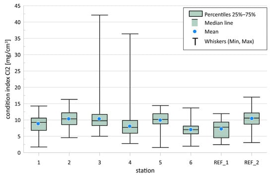 Two morphometric condition indices, CI1 and CI2 [19,30,31,32], were calculated. The first condition index (CI1) was calculated using the following formula: