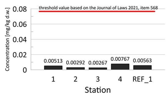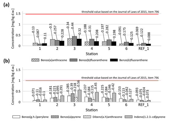 In the context of bottom sediments in the southern Baltic Sea, where PAH concentrations ranged from 0.01 to 7.0 mg·kg−1 DW [63], the obtained results are comparable, although in some cases, higher values were observed, particularly at station 3. Compared to sediments from the Gulf of Gdańsk, where PAH concentrations ranged from 0.235 to 2.205 mg·kg−1 DW [64] and up to 2.24 mg·kg−1 DW [65], the studied sediments in some locations exhibited higher values, especially around station 3 (Table 1).