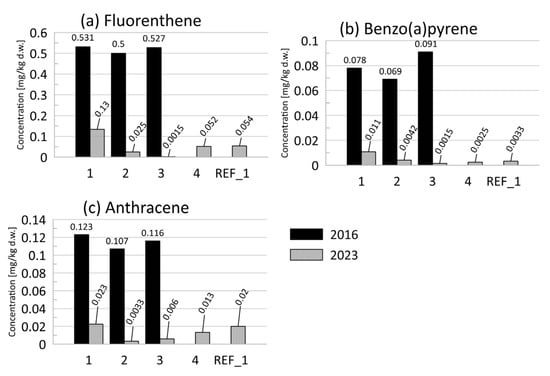 The studies conducted in 2023 at the M. trossulus sampling sites (stations 1–6) revealed that the total PAH concentrations in the analyzed sediments ranged from 1.28 to 4.4 mg·kg−1 DW, with the highest value recorded at station 3. In the reference point REF_1, the concentration was lower (0.89 mg·kg−1 DW) (Figure 13a,b). A comparison of these results with data from 2016 indicates a decrease in PAH concentrations in the immediate vicinity of the wreck, where previous studies reported significantly higher PAH and TPH levels [6]. This decreasing trend is consistent with reports from other regions of the southern Baltic Sea, where systematic reductions in PAHs have been observed over the past decades, likely as a result of environmental regulations, improvements in maritime transport standards, and reduced industrial discharges [61].