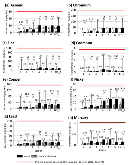 Total metal content in sediments was determined by inductively coupled plasma optical emission spectrometry (ICP-OES; Agilent 5800, Santa Clara, CA, USA) following acid digestion, with detection limits of 0.25 mg·kg−1 for most metals and 0.05 mg·kg−1 for Cd. Labile metal forms were extracted using a diluted HCl solution prepared from hydrochloric acid, ACS reagent, 37% (Merck KGaA, Darmstadt, Germany). Mercury (Hg) was quantified by atomic absorption spectrometry (AAS) with gold amalgamation (MA-2, Nippon Instruments Corp., Kyoto, Japan; LOQ: 0.01 mg·kg−1). Mussel tissue was analyzed for Pb, Cd, and As using inductively coupled plasma mass spectrometry (ICP-MS; NexION 350D, PerkinElmer, Waltham, MA, USA) after microwave-assisted digestion, with detection limits of 0.002 mg·kg−1 for Cd and 0.005 mg·kg−1 for Pb and As. Mercury (Hg) was determined by AAS (MA-2, Nippon Instruments Corp., Japan; LOQ: 0.005 mg·kg−1). The results obtained were expressed per dry or wet weight.