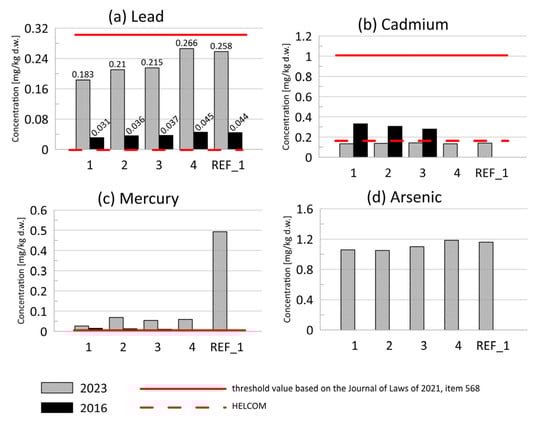 - Hendożko, E.; Szefer, P.; Warzocha, J. Heavy metals in Macoma balthica and extrable metals in sediments from southern Baltic Sea. Ecotoxicol. Environ. Saf. 2010, 73, 152–163. [Google Scholar] [CrossRef]