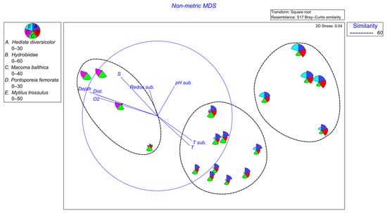 Distance-based redundancy analysis (dbRDA), DistLM, and BEST routines were used to identify the abiotic factors that significantly co-varied with the macrozoobenthos community structure. Due to data limitations, the descriptors were divided into two subsets: environmental variables [depth, distance from wreckage (Dist), water temperature (T), sediment temperature (T sed.), salinity (S), oxygen concentration (O2), sediment pH (pH sed.), and sediment redox (Redox sed.)] for 18 stations from 2023 and chemical variables (TPH; metals: Cu, Zn, Ni, Cd, Pb, Hg; fluoranthene; indeno(1, 2, 3,-cd)pyrene; benzo(g, h, i)perylene; benzo(a)pyrene; benzo(b)fluoranthene; TBT; DBT; MBT) for 7 stations from 2023. Both data sets were normalized.