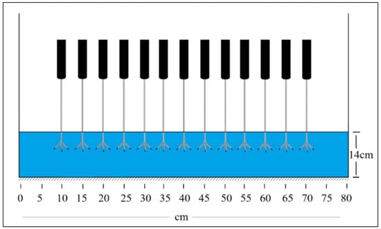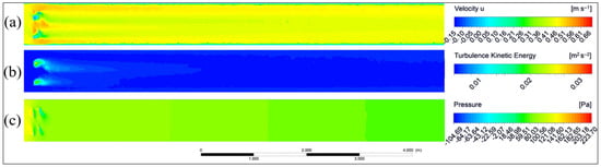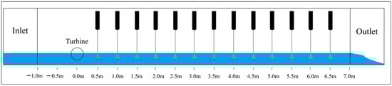 Figure 17. This is determined according to the distribution of turbulence kinetic energy (TKE) in a 0.80 m wide open water channel, following the operation of two turbines or rotors. High-TKE regions are observed immediately downstream of the turbines, particularly within the first 0.5–1 m, indicating strong wake turbulence and energy dissipation. As the flow progresses, TKE rapidly decreases, and by approximately 2–3 m downstream, the turbulence levels are noticeably lower, suggesting significant wake recovery. Beyond 4 m, TKE values approach background levels, indicating that the wake has largely dissipated and the flow is stabilizing.