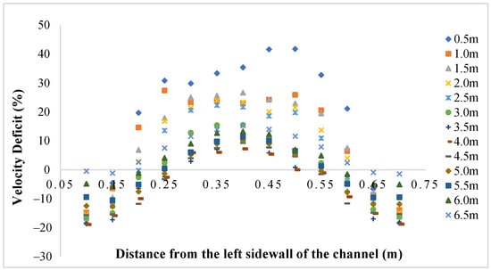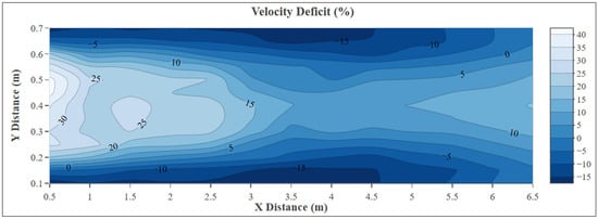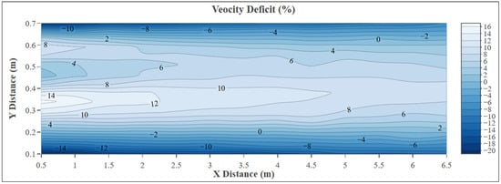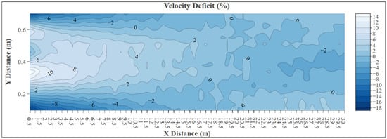Figure 10) along the centerline and lateral positions of the channel, extending from the turbine location 0.5 m to 30 m downstream, reveal a clear wake recovery trend. Maximum velocity deficits, ranging between −15% and −20%, are observed within the first 1–3 m after the turbine, particularly at mid-channel positions. Between 5 m and 10 m, a significant reduction in deficit magnitude occurs, with values decreasing to below −5% in most lateral sections, indicating the gradual re-acceleration and redistribution of the flow. Beyond 15 m, the velocity deficit becomes negligible or even transitions to slightly positive values across most of the cross-section, suggesting that the wake has nearly dissipated and the flow has returned to a more uniform, steady profile.