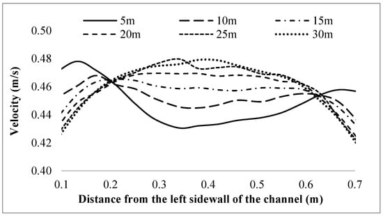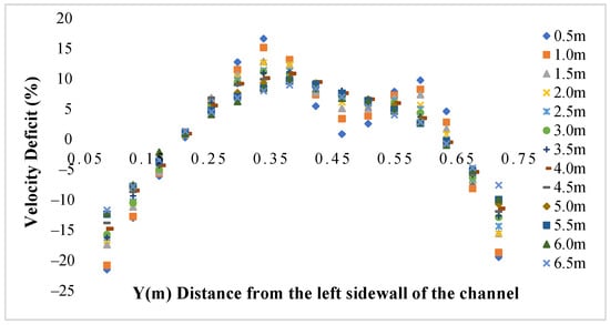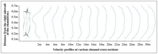 Figure 15. In the early sections (2–6 m), a noticeable velocity deficit near the mid-depth of the channel indicates the presence of a well-defined wake region. As the flow progresses beyond 10 m, the profiles gradually become more symmetric and smoother, suggesting progressive wake recovery through turbulent mixing and momentum diffusion. By 18–20 m, the velocity curves closely resemble the freestream shape, indicating that the wake has substantially dissipated and the flow has nearly returned to uniform conditions.