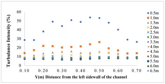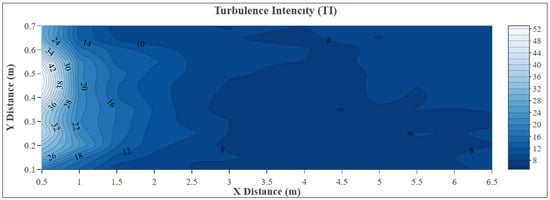 Figure 12) of 13 lateral positions and 13 downstream sections from 0.5 m to 6.5 m provides insight into the wake-induced unsteadiness in the flow field downstream of the hydrokinetic turbine. As expected, TI values are significantly elevated in the near-wake region, with maximum values exceeding 50% at the mid-span of the channel (e.g., 0.45 m and 0.50 m lateral positions at 0.5 m downstream). These elevated turbulence levels are indicative of strong rotor-induced shear and vortex shedding. As the flow progresses downstream, the clear attenuation of TI is observed across the entire span of the channel. Between 1.0 m and 3.0 m, TI values decrease sharply, particularly in the central region, where values drop from over 20% to below 10%. This trend confirms the progressive dissipation of turbulence and energy redistribution as the wake recovers.