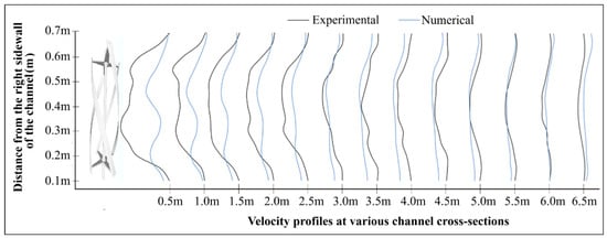 Figure 14) downstream of the turbine reveals a generally consistent trend in the lateral distribution of flow velocities, with notable differences in magnitude and profile steepness. At 0.5 m, the numerical results exhibit higher velocities in the central region of the channel (e.g., 0.35 m to 0.45 m), where experimental data show significantly lower values due to more pronounced wake-induced velocity deficits. This discrepancy is likely attributed to the limitations of steady-state turbulence modeling in capturing complex unsteady wake structures observed in experiments. On the other hand, at 6.5 m, the agreement between the two datasets improves, particularly near the channel center, where velocity differences fall within a margin of ±0.02 m/s in most positions. Both profiles demonstrate wake recovery, yet the numerical solution appears to slightly overpredict velocities near the wake core while underpredicting them near the sidewalls. These observations suggest that while the CFD model captures the general behavior of wake expansion and velocity redistribution, it tends to smooth out the local velocity gradients observed in physical measurements, especially in the near-wake zone. Each velocity profile was measured multiple times (at least three times) at every sampling point, and the standard error values remained low across all measurements, confirming the consistency of the experimental results. The Acoustic Doppler Velocimeter (ADV) was calibrated prior to data collection, and no significant sensor drift was observed throughout the measurement campaign.