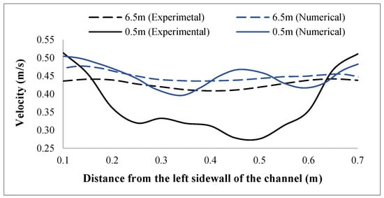 The comparison of numerical and experimental cross-sectional velocity profiles at 0.5 m and 6.5 m (