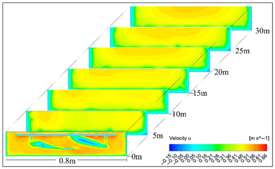 Figure 16) reveal the wake recovery dynamics along the longitudinal axis of the channel. In the near-wake region (5–10 m), moderate velocity deficits are still present, particularly at the center of the channel (around 0.35–0.45 m), where velocities remain in the range of 0.43–0.45 m/s. This indicates that although the initial wake deficit has diminished compared to the turbine exit region, flow re-stabilization is still ongoing. Between 15 m and 20 m, the axial velocities gradually increase across the entire width of the channel, with values typically rising above 0.46 m/s, especially in the mid-span zone (0.25–0.45 m). This trend reflects significant momentum recovery and reduction in turbulence intensity in the wake core. Such recovery behavior is critical in determining optimal spacing for turbine arrays, as insufficient wake development can result in power loss and increased structural loading on downstream units. Based on the observed velocity uniformity beyond 18–20 m, this region is suggested as a feasible location for the placement of a second turbine in series.