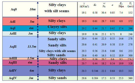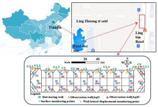 The foundation pit is located to the north of the intersection of Lingbin Road and Lingzhuozhi Road in Nankai District, Tianjin. The dimensions of the foundation pit are reported to be 155 m in length, 40 m in width, and 16.9 m in depth. The enclosure structure consists of a diaphragm wall with a thickness of 0.8 m and a depth of 32.5 m. According to the survey data, the soil quality of the site is primarily classified as silty clay, silt, and sandy silt [51,59,79,84]. The stratigraphic profile consists of five aquifers (Aq0–AqIV), separated by weakly permeable layers (AdI–AdIV), among which the soil thickness of Aq0–AqIV is 10.0 m, 4 m, 13.5 m, 4 m, and 3 m, respectively. The initial water levels of Aq0–AqIV were 2.0 m, 2.7 m, 3.0 m, 3.2 m, and 3.7 m, respectively. For a detailed distribution of typical soil layers and their mechanical parameters, one can refer to the article by Zeng et al. [6,7,8,9,10,51,52,53,54,67,68]. A series of observation points were arranged around the foundation pit. Considering the symmetry of the pit and the similarity of soil conditions in the north and south directions, this paper only shows the water level observation well arranged on the north side (as shown in Figure 1).