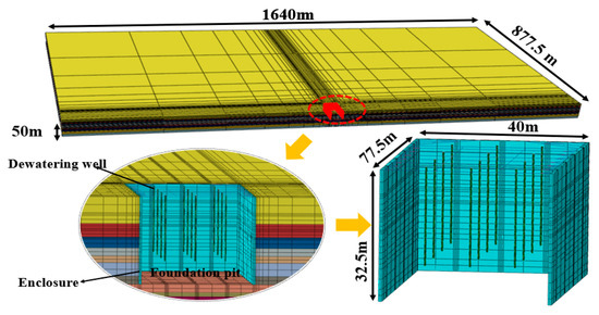 To optimize computational efficiency while maintaining accuracy, the numerical model was developed using a half-section representation that capitalizes on the foundation pit’s symmetrical configuration (as shown in Figure 2). To eliminate boundary interference effects, the influence radius (R) of pumping was determined as 615 m according to the Sichardt formula [1]. During the simulation, the final drawdown of the water level in AqII was set to 35.5 m, with a hydraulic conductivity (K) of 3 m/d. Consequently, the overall model dimensions were set to 1440 m × 777.5 m × 50 m.