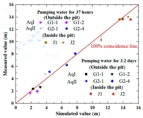 Comparison of measured and simulated values of groundwater drawdown at different times (adapted from reference [10]).