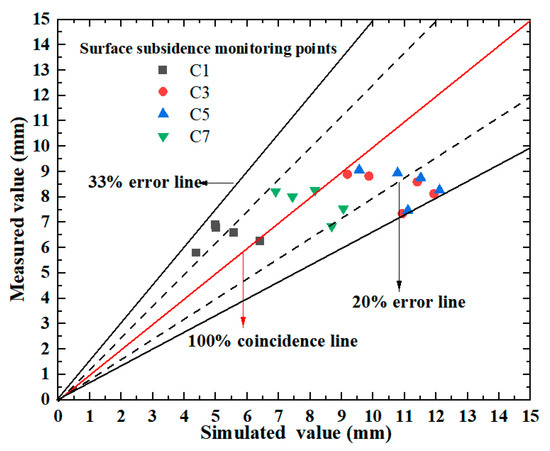 To assess the reliability and predictive capability of the numerical model, a comparative analysis was conducted between the simulated and observed groundwater drawdowns both inside and outside the foundation pit. Two representative time points were selected for evaluation: the mid-stage of pumping (37 h) and the end of pumping (3.2 days). As shown in Figure 4, the simulation results closely match the field measurements at both time points, demonstrating high accuracy. Additionally, the simulated surface subsidence after pumping was compared with observed values (Figure 5), showing only minor discrepancies. This indicates that the model effectively captures the ground deformation behavior. Overall, the validation results confirm that the numerical model reliably reproduces the coupled processes of groundwater drawdown and soil deformation in multi-layered aquifer systems under pumping conditions.