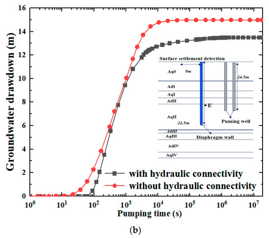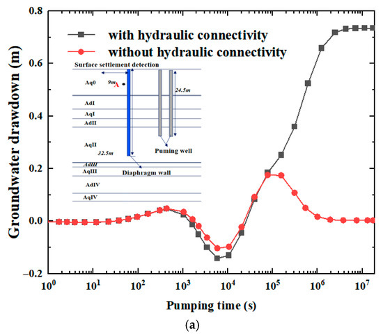 Figure 6 illustrates the variations in groundwater drawdown under different hydraulic connectivity conditions. The monitoring results demonstrate significant differences in groundwater response patterns between the excavation interior (point E′) and exterior (point A). At the exterior monitoring point (point A), the phreatic water level exhibited a characteristic fluctuation pattern of initially rising, then declining, and finally rebounding, indicating potential delayed responses from deeper aquifers. In contrast, the interior point (point E′) displayed a continuous increase in drawdown magnitude with prolonged pumping time.