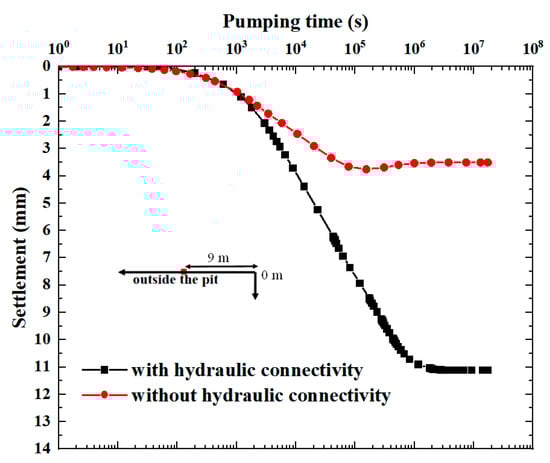 Figure 7 illustrates the variations in land subsidence outside the foundation pit under different hydraulic connectivity conditions. The monitoring data reveal a striking contrast in land subsidence behavior depending on the hydraulic connectivity conditions. When the excavation interior maintains hydraulic connection with the surrounding, the resulting land subsidence becomes substantially more pronounced compared to under disconnected conditions. The maximum subsidence with hydraulic connectivity reaches a value approximately three times greater than that observed in disconnected scenarios. This dramatic difference stems from several interconnected mechanisms. First, the established hydraulic connection facilitates broader propagation of pumping-induced depressurization through the groundwater flow regime. This extended influence allows pore water pressure reductions to affect more distant soil masses, triggering widespread consolidation settlements. Second, the prolonged stabilization period characteristic of connected systems—nearly double the duration required in isolated conditions—permits additional time-dependent deformation through soil creep processes. These combined effects explain the significantly amplified settlement magnitudes observed when hydraulic continuity exists across the excavation boundary.