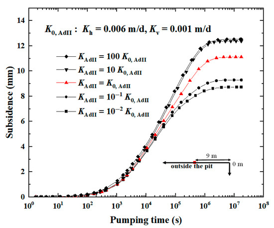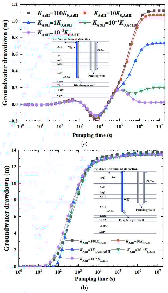 To systematically investigate the evolution patterns of groundwater drawdown and land subsidence induced by foundation pit pumping under various hydrogeological conditions, this study employed a parametric analysis approach by conducting numerical simulations with multiple scenarios of permeability coefficients for the typical aquitard (AdIIlayer). The permeability coefficients were systematically varied as follows: 10−2 K0,AdII, 10−1 K0,AdII, 10 K0,AdII, and 100 K0,AdII, where K0,AdII is the conventional permeability coefficient of the soil layer. This parameter combination effectively covers typical working conditions ranging from nearly impermeable layers to highly permeable formations, enabling quantitative analysis of how aquifer connectivity affects the coupling mechanism between groundwater seepage fields and soil deformation.