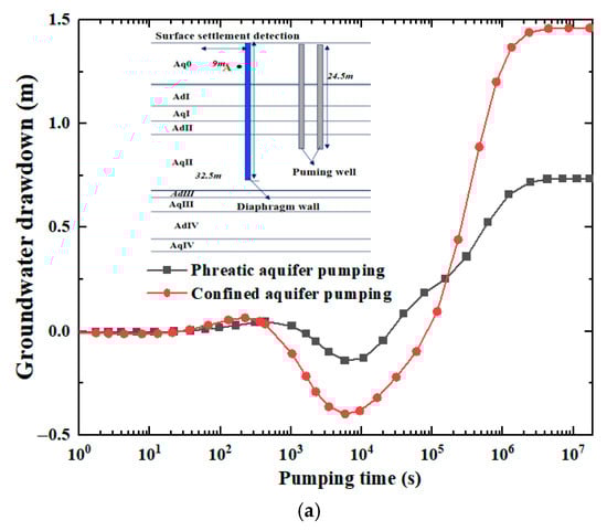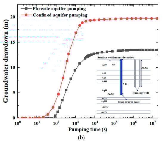 The temporal evolution of groundwater drawdown under different site conditions: (a) point A; (b) point E′.
