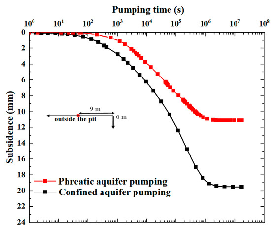 Figure 11 illustrates the variations in land subsidence outside the foundation pit under different pumping conditions. The observed difference in land subsidence behavior between confined aquifer pumping and phreatic layer pumping stems from their distinct hydrogeological mechanisms. When pumping from confined aquifers, the artesian pressure enables immediate stress transfer to overlying strata, causing rapid initial settlement. However, the low-permeability confining layers significantly hinder pore water dissipation, thereby extending the consolidation duration. Moreover, confined aquifer systems generally affect a broader zone with a greater compressible soil volume, necessitating more time to achieve complete equilibrium. This explains why the stabilization time for confined aquifer pumping is typically 1.1 times longer than that of phreatic layer pumping—the combination of rapid initial pressure release and subsequent slow drainage through multiple restrictive layers creates this characteristic pattern. In contrast, phreatic layer pumping exhibits slower initial settlement, but achieves stabilization more quickly, as water drains directly through higher-permeability materials without the impedance of confining layers. The extended stabilization period in confined systems reflects the more complex, multi-layer drainage process compared to the relatively straightforward drainage mechanism in unconfined aquifers.
