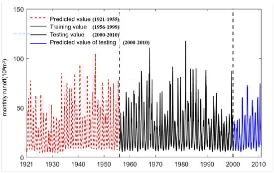 Based on the traditional statistical method, the ratio of restored runoff value and return runoff value was calculated by proportion, and the ratio of the mean value of restored runoff value and return runoff value of Lanzhou Station from 1956 to 2010 was 1.03. Then, the monthly restored runoff value of each year was deduced according to the restored runoff value of each month in 1956–2010. Lanzhou Station monthly runoff extension values are shown in Figure 4. As can be seen from Figure 4, because the traditional statistical method relies extensively on linear relationships and is difficult to adapt to complex hydrological data changes, the runoff extension results obtained are relatively smooth and do not reflect the complex characteristics of runoff changes.