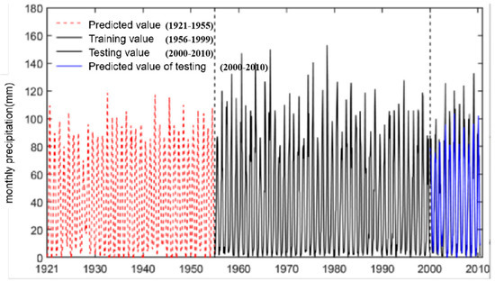 The linear regression model of precipitation and runoff at Lanzhou Station was constructed based on the annual precipitation, return runoff and restored runoff data of the control section of Lanzhou Station in the upper Yellow River from 1956 to 2020. The precipitation extended series was obtained based on the restored runoff series from 1921 to 1955, and then the annual distribution was carried out according to the average proportion of monthly precipitation in multiple years from 1956 to 2010. Lanzhou Station’s monthly precipitation extension values are shown in Figure 3. It can be seen from Figure 3 that the proposed method can also reflect the general trend of precipitation to a certain extent, but its ability to capture data details is weak compared with machine learning and deep learning methods.