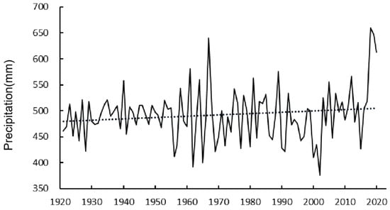 Based on the annual data of precipitation and restored runoff from 1956 to 2020, a linear fitting model between them was constructed and the linear fitting equation was determined. Then, the annual values of restored runoff from 1921 to 1955 were substituted into the equation to obtain the extended annual values of precipitation from 1921 to 1955. Furthermore, according to the proportion of the monthly precipitation values in the annual average of 1956–2020, the annual precipitation extended values were allocated, and finally, the monthly precipitation extended values were obtained.