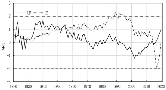 Sudden mutation test of the precipitation series from 1921 to 2020.