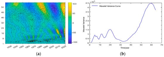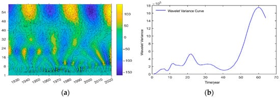 Time-frequency distribution map of the real part of the wavelet coefficient (a) and the wavelet variance results (b) of the 100-year runoff series of Lanzhou Station.