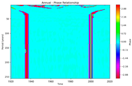 The phase relation plot further corroborates the conclusion of the cross-wavelet power plot. In the time axis near 1940 and 2000, and in the period axis near 50 years, there are areas of concentrated red. This indicates that there is a relatively fixed phase difference between the precipitation and runoff series at these time points and around the 50-year cycle, and there is a specific lead or lag relationship between the signals. Specifically, the study showed that precipitation changes first, and runoff responds after a fixed time interval.