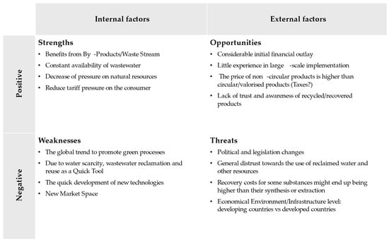 SWOT analysis of the wastewater sector regarding the implementation of circular economy (adapted from Guerra-Rodríguez et al. and Kathi et al. [29,30]).