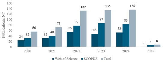 Using the raw data retrieved from the Scopus and Web of Science databases and the search query presented in Table 1, it was possible to create a graph (Figure 2) which presents the increasing trend in publications about a circular economy in wastewater systems, in the last five years.