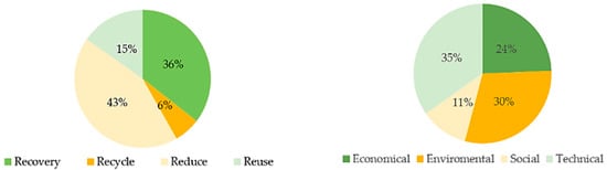 Analysis of Figure 6 reveals that the strategies which have been extensively developed within the scientific community are as follows: reduce and recovery; as previously stated. The focus on reduction stems from the historical goal of operators to lower operational expenditure (OPEX) and reduce the consumption of raw materials. Recovery is emphasised because Water Resource Recovery Facilities (WRRF) possess significant resources that can be extracted and marketed; however, this approach primarily depends on the treatment technology available (CAPEX and OPEX are crucial to accelerating to the next steps). On the other hand, the reuse and recycling strategies are influenced by the differences in administrative procedures, legislative constraints, and community perspectives.