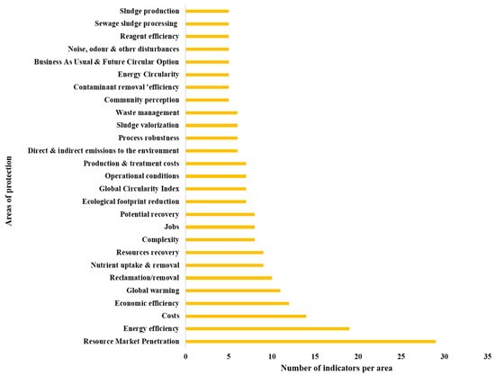 The KPIs were also statistically analysed and grouped into key areas of protection (Figure 7). The most frequently mentioned areas include resource market penetration, energy efficiency, costs, economic efficiency, global warming, reclamation and removal, nutrient uptake and removal, resource recovery, and complexity [24,33,51,52,53,54,55,56,57,58,59]. Besides, more articles have been consulted and analysed to clearly define groups and other analyses, which can be observed on the SM [60,61,62,63,64,65,66,67,68,69,70,71,72,73,74,75,76,77,78,79,80,81,82,83,84].