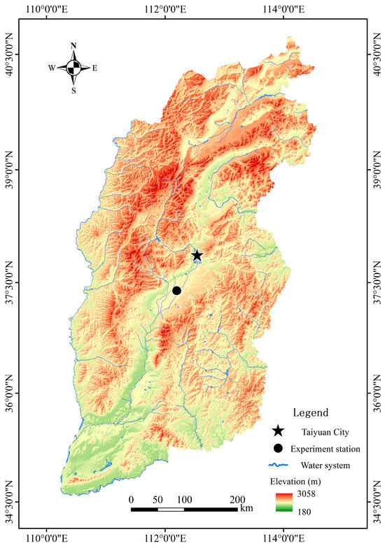 The experiment was conducted from November 2023 to March 2024 at the Scientific Research Service Center of Shanxi Fenhe River Irrigation Management Co., Ltd., located in Liu Hulan Town, Wenshui County, Lüliang City, Shanxi Province, China (37°23′27″ N, 112°11′51″ E; elevation: 749 m). The site lies within the Fenhe alluvial–proluvial plain of the Taiyuan Basin (Figure 1). The experimental area, cultivated with maize, experiences no irrigation during winter months. Groundwater levels fluctuated between 1.01 and 2.87 m below the surface. Regional climatic conditions include a multi-year average annual sunshine duration of 2551.9 h, mean annual air temperature of 10.1 °C, average ground temperature of 12.4 °C, mean wind speed of 2.0 m/s, multi-year average annual precipitation of 457 mm, mean relative humidity of 63%, and a frost-free period averaging 183 days.