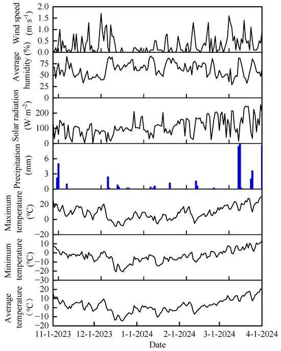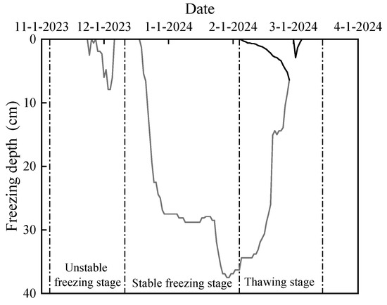 During the experimental period, the groundwater table depth ranged from 2.63 to 2.87 m, with variations in meteorological factors shown in Figure 2. Based on soil freeze–thaw characteristics, the freeze–thaw period was divided into three stages, such as the unstable freezing stage (5 November to 11 December 2023), the stable freezing stage (12 December 2023, to 4 February 2024), and the thawing stage (5 February to 15 March 2024), as shown in Figure 3. During the unstable freezing stage, air temperatures fluctuated below 0 °C, inducing repeated diurnal thawing and nocturnal freezing of surface soil, with a maximum freezing depth of 7.5 cm. In the stable freezing stage, the thickness of the frozen layer increased rapidly and steadily, with the maximum frozen depth of 37.5 cm on 29 January 2024. The thawing stage was characterized by bidirectional thawing of the frozen layer (simultaneous thawing from both the surface and subsurface), and the frozen layer was finally completely thawed on 4 March 2024.