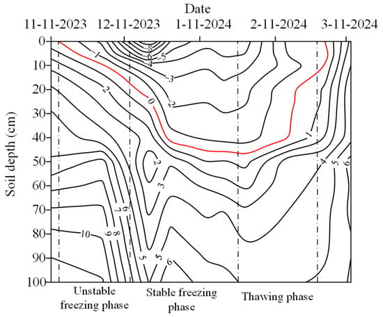 The soil temperature during the freeze–thaw period was monitored using pre-installed thermistors at 10:00 a.m. at the depths of 0, 5, 10, 15, 20, 25, 30, 40, 50, 60, 70, 80, 90, and 100 cm.