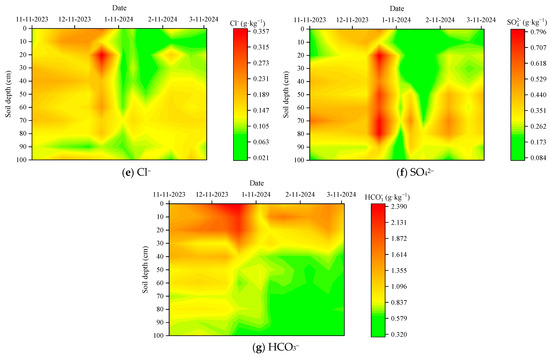 The variations in cations and anions during the freeze–thaw period are shown in Figure 5. Na+, Cl−, and SO42− were widely distributed at the depth of 0–100 cm, with concentrations of 0.19–0.73 g·kg−1, 0.02–0.36 g·kg−1, and 0.09–0.80 g·kg−1, respectively. Mg2+ and K+ were predominantly concentrated at the depth of 0–40 cm (0.02–0.52 g·kg−1 and 0.01–0.26 g·kg−1), which is attributed to the high organic matter content from residual maize roots post-harvest, which enhanced CEC and promoted the surface accumulation of Mg2+ and K+ [43]. Additionally, Mg2+, with its large ionic radius and positive charge, exhibited strong adsorption onto soil colloids in silt-rich layers [44], resulting in Mg2+ concentrations at the depth of 0–40 cm being approximately 7-fold higher than those at the depth of 40–100 cm (Figure 5a,b). HCO3− was primarily distributed at the depth of 0–60 cm (0.56–2.38 g·kg−1), while Ca2+ showed uniform but low concentrations (0.02–0.05 g·kg−1) throughout the entire profile.