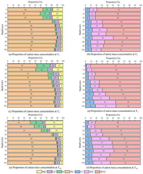 Three freeze–thaw stages—T1 (unstable freezing stage), T7 (stable freezing stage), and T10 (thawing stage)—were selected to analyze the migration capabilities of soil salt ions. The mass proportions of soil cations and anions from 0 to 100 cm are shown in Figure 6.
