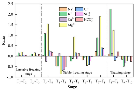 At the thawing stage (T10), after complete thawing of the frozen layer, the ranking order of mass proportion for cations and anions reverted to the order before freezing. The proportions of Na+, K+, and Ca2+ decreased at the depth of 0–20 cm after soil thawing, while Mg2+ exhibited significant enrichment. For anions, HCO3− decreased while SO42− increased at the depth of 0–80 cm, and Cl− increased at the depth of 0–50 cm.