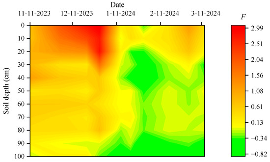 A positive value of F indicates soil salinization degree above the mean observed during the experimental period, while negative values correspond to either below-average salinization or the absence of salinization. The variation in F is shown in Figure 9.