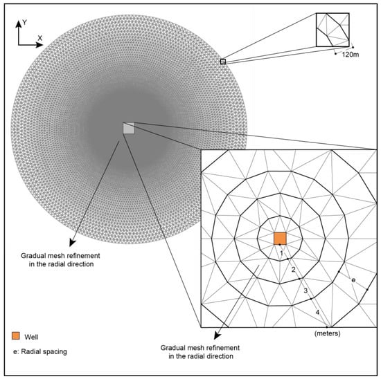 The cylindrical domain represented the unstructured meshes with progressive radial refinement towards the center, forming circular sectors that are subdivided into triangles that decrease in size as they approach the center (Figure 1). At the model’s center, a 1 m square cell contained the extraction well, which spanned the entire aquifer.