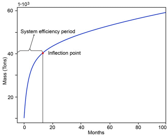 Figure 3 illustrates an example of this behavior among the 6970 simulated scenarios, representing a 50 m thick aquifer with an initial concentration of 10.5 kg/m3, a hydraulic conductivity of 20 m/d, 30% specific yield, 10% vertical anisotropy, 10 m longitudinal dispersivity, and a molecular diffusion coefficient of 0.5703 m2/d. The system was more efficient up to 14 months, which marked the inflection point. This value was determined mathematically using the Python library KneeLocator. The code tested different combinations of configurations, analyzed the fitted curve, and calculated the point where the second derivative was most pronounced, indicating the highest relative curvature.