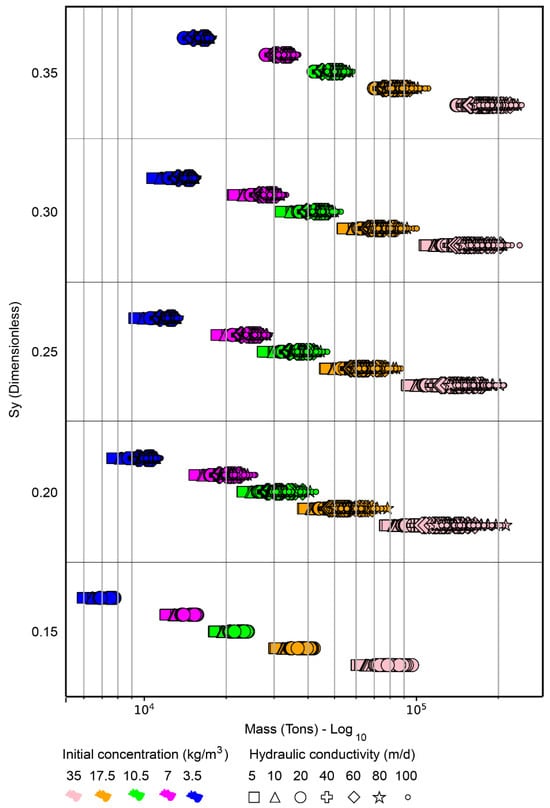 Extracted mass values vs. specific yield, with initial concentration (color) and hydraulic conductivity (geometric shape) during peak efficiency.