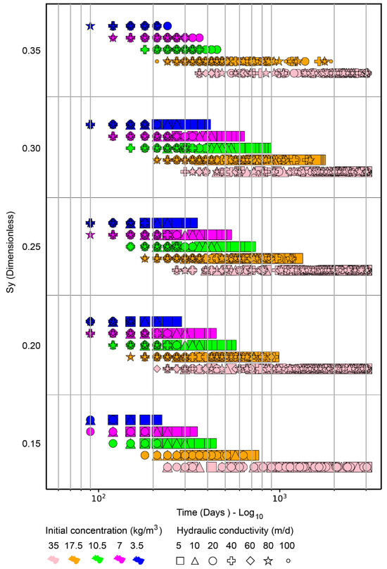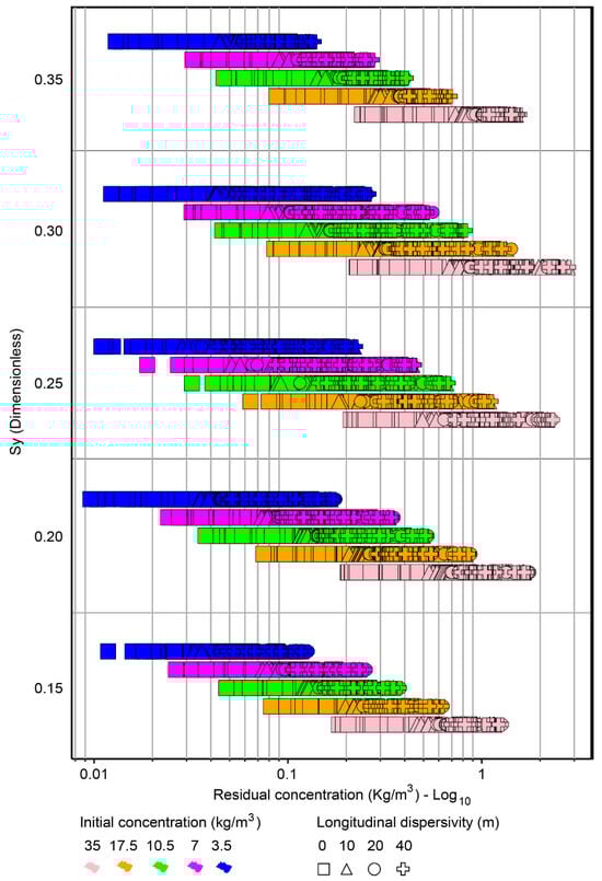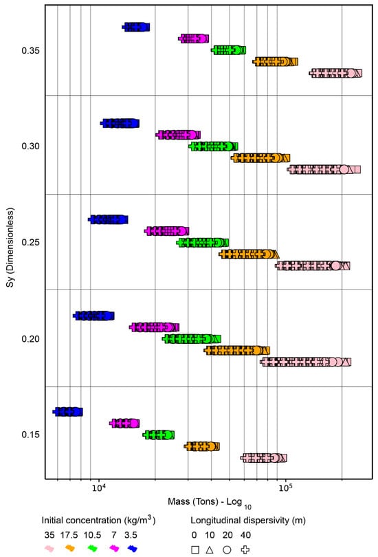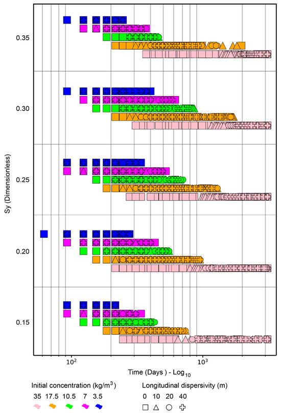 Mechanical dispersion influences the critical scenarios in terms of mass extraction. According to Figure 10, the correlation between mechanical dispersion and the time required for a scenario to reach a residual concentration of 0.5 kg/m3 became stronger as the initial concentration increased. This phenomenon, produced by mechanical dispersion, became more noticeable at the concentration of 35 kg/m3, with its effect increasing linearly with specific yield when analyzed on a logarithmic scale.