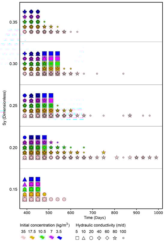 Time necessary to reach a residual concentration equal to 0.5 k/m3 vs. specific yield, with initial concentration (color) and hydraulic conductivity (geometric shape).